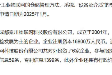 金融界消息,國家知識產權局信息顯示,成都秦川物聯網科技股份有限公司取得一項名為“基于工業物聯網的倉儲管理方法、系統、設備及介質”的專利,授權公告號CN119417369B,申請日期為2...[詳細]