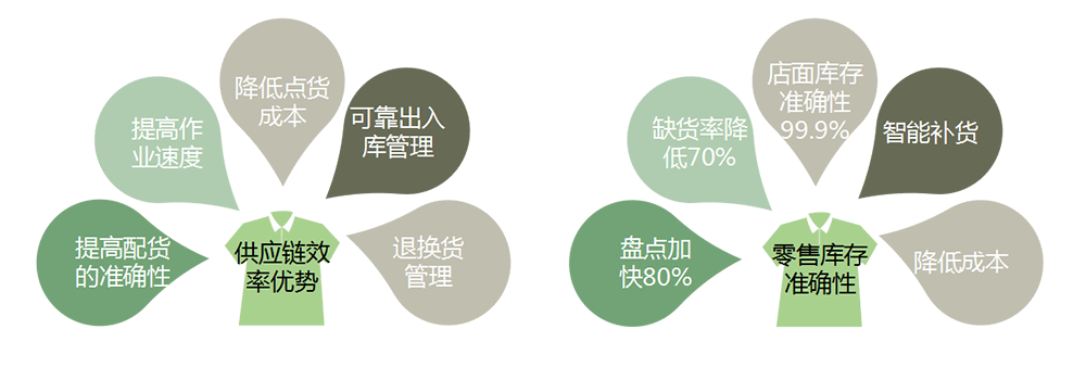 利用RFID技術幫助時尚行業品牌商在供應鏈管理、零售管理和企業內部管理等環節實現產品的快速掃描與讀取,進而實現產品從原料到半成品、成品、運輸、倉儲、配送、上架、銷售、甚至退貨處理等環節的實時監控,建立安全可靠的管理模式,助力企業實現低成本且高效率的供應鏈運營體系。