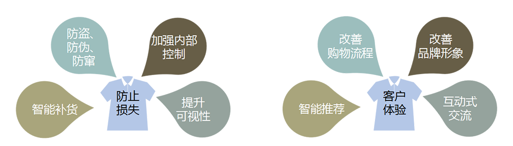> 門店搭配和導購信息通過RFID標簽的互動感應為客戶添加科技感的同時還可以快速將試衣、拿樣 等數據采集入系統。