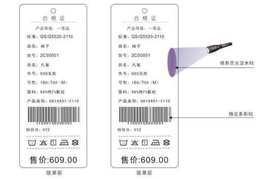2. 產品簡介:熒光又稱紫外線光,使用特殊熒光油墨結合到標簽上,肉眼和手感觸摸無法找到流水碼、文字或圖案所在處,必須使用熒光燈也就是紫外線燈照射才能看到,隱形熒光流水碼一般使用在企業防竄貨上較廣,隱形文字、圖案多用于防偽技術。