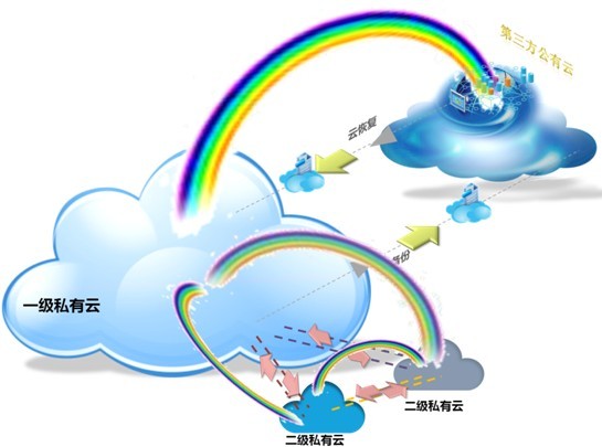 混合云彩虹解決方案能夠將用戶內部二級云、總部云與第三方公有云進行有效融合,實現資源在用戶內部的上下級互通以及由私有云到公有云的動態擴展。混合云彩虹主要解決了私有云數據中心災備、突發訪問和資源擴展這三方面問題