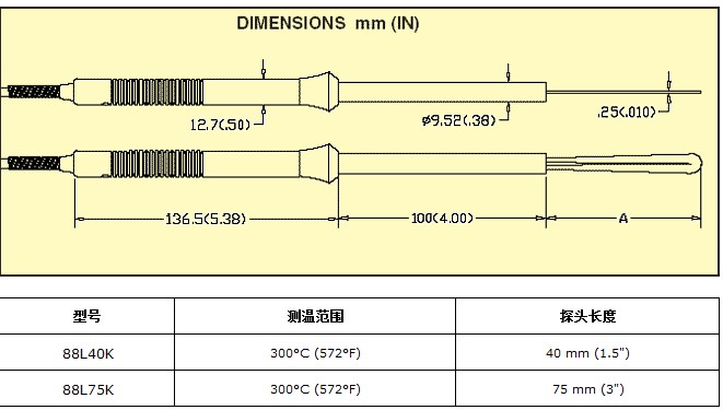 88L40K/88L75K葉狀,片狀平板熱電偶探頭|美國omega可插入縫隙測溫探頭 測溫范圍:0to300°C (32to572°F) K型熱電偶探頭 精度:±2°C(4°F),相應速率:<5秒 40mm和75mm探頭長度,探頭最薄部分:0.25mm厚 輸出引線:彈簧式可拉升至1.5米,帶迷你型熱電偶插頭 獨特的葉表面的探針設計即時測量平坦的表面溫度,并提供特殊的表面溫度探頭的能力,尤其是插入縫隙測溫.