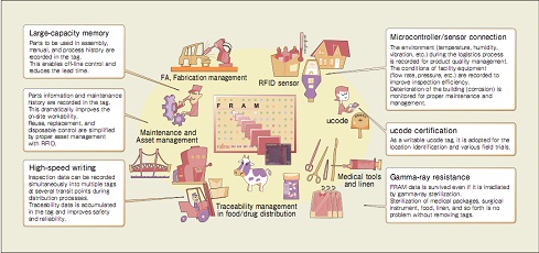 到目前為止,富士通半導體已經開發出了高頻段(13.6MHz)和超高頻段(860 MHz到960 MHz)RFID LSI產品。這些產品最重要的特點就是它們內嵌FRAM。由于擦寫速度快、耐擦寫次數高,它們已經作為數據載體型被動RFID LSI而被全世界廣泛采用。