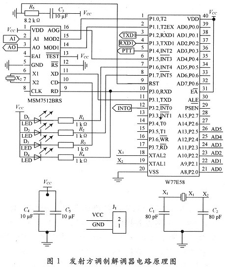 系(xi)(xi)統(tong)使(shi)(shi)用(yong)+5 V的(de)(de)(de)(de)(de)(de)(de)(de)電(dian)源(yuan)(yuan)由無線(xian)電(dian)臺(tai)的(de)(de)(de)(de)(de)(de)(de)(de)電(dian)池變換后供(gong)給(gei)。MSM7512 B使(shi)(shi)用(yong)專用(yong)的(de)(de)(de)(de)(de)(de)(de)(de)3.579 545 MHz的(de)(de)(de)(de)(de)(de)(de)(de)晶體,由于(yu)其內部(bu)有(you)接(jie)(jie)地(di)電(dian)容,不用(yong)外(wai)接(jie)(jie)補償元件(jian);單片(pian)機(ji)(ji)(ji)使(shi)(shi)用(yong)頻率為11.059 2 MHz的(de)(de)(de)(de)(de)(de)(de)(de)晶體,主要是為了在波(bo)(bo)特(te)率設置時(shi),可(ke)以取得(de)準確(que)的(de)(de)(de)(de)(de)(de)(de)(de)波(bo)(bo)特(te)率,能有(you)效避免(mian)定時(shi)器(qi)工(gong)作產生的(de)(de)(de)(de)(de)(de)(de)(de)積累誤(wu)差(cha),外(wai)接(jie)(jie)的(de)(de)(de)(de)(de)(de)(de)(de)補償元件(jian)是二(er)個(ge)30 pF電(dian)容。為了防(fang)止(zhi)單片(pian)機(ji)(ji)(ji)程(cheng)序運行(xing)時(shi)的(de)(de)(de)(de)(de)(de)(de)(de)誤(wu)操作,應將單片(pian)機(ji)(ji)(ji)EA/VPP端(31腳)置高電(dian)平,確(que)保單片(pian)機(ji)(ji)(ji)訪問(wen)內部(bu)的(de)(de)(de)(de)(de)(de)(de)(de)程(cheng)序存(cun)儲器(qi)。由于(yu)調(diao)制解(jie)調(diao)芯片(pian)MSM7512B和(he)(he)(he)單片(pian)機(ji)(ji)(ji)W77E58都支持(chi)TTL電(dian)平,所以單片(pian)機(ji)(ji)(ji)的(de)(de)(de)(de)(de)(de)(de)(de)第一串(chuan)行(xing)通信(xin)(xin)口TXD,RXD可(ke)以直接(jie)(jie)與(yu)MSM75125B的(de)(de)(de)(de)(de)(de)(de)(de)XD和(he)(he)(he)RD相連(lian);單片(pian)機(ji)(ji)(ji)的(de)(de)(de)(de)(de)(de)(de)(de)P1.0,P1.1分(fen)別連(lian)接(jie)(jie):MSM7512B的(de)(de)(de)(de)(de)(de)(de)(de)MOD2和(he)(he)(he)MOD1,按(an)通信(xin)(xin)的(de)(de)(de)(de)(de)(de)(de)(de)要求,在收發(fa)(fa)之間(jian)轉換,以控(kong)制調(diao)制解(jie)調(diao)芯片(pian)的(de)(de)(de)(de)(de)(de)(de)(de)工(gong)作狀態;P1.4則控(kong)制無線(xian)電(dian)臺(tai)收/發(fa)(fa)狀態的(de)(de)(de)(de)(de)(de)(de)(de)轉換(PTT)。MSM75125B的(de)(de)(de)(de)(de)(de)(de)(de)AO和(he)(he)(he)AI分(fen)別通過(guo)接(jie)(jie)口電(dian)路與(yu)無線(xian)電(dian)臺(tai)的(de)(de)(de)(de)(de)(de)(de)(de)送(song)/受話器(qi)相連(lian)。作為系(xi)(xi)統(tong)外(wai)部(bu)監視的(de)(de)(de)(de)(de)(de)(de)(de)顯(xian)示(shi)(shi)(shi)(shi)電(dian)路全部(bu)由發(fa)(fa)光(guang)二(er)極(ji)管和(he)(he)(he)電(dian)阻構(gou)成(cheng),其中紅色發(fa)(fa)光(guang)二(er)極(ji)管D1為電(dian)源(yuan)(yuan)指示(shi)(shi)(shi)(shi),亮則表(biao)示(shi)(shi)(shi)(shi)系(xi)(xi)統(tong)的(de)(de)(de)(de)(de)(de)(de)(de)初始化過(guo)程(cheng)正確(que);黃色發(fa)(fa)光(guang)二(er)極(ji)管D2為發(fa)(fa)送(song)正確(que)指示(shi)(shi)(shi)(shi),系(xi)(xi)統(tong)每正確(que)完成(cheng)一次數(shu)(shu)據(ju)發(fa)(fa)送(song)任務,它應閃爍(shuo)一次;D3為載波(bo)(bo)檢(jian)測(ce)(ce)指示(shi)(shi)(shi)(shi),如(ru)果亮則表(biao)示(shi)(shi)(shi)(shi)調(diao)制解(jie)調(diao)[FS:PAGE]器(qi)檢(jian)測(ce)(ce)到了信(xin)(xin)道中的(de)(de)(de)(de)(de)(de)(de)(de)有(you)效載波(bo)(bo)信(xin)(xin)號;D4為數(shu)(shu)據(ju)傳輸指示(shi)(shi)(shi)(shi),系(xi)(xi)統(tong)在發(fa)(fa)送(song)數(shu)(shu)據(ju)時(shi)它就開(kai)始閃爍(shuo),直至數(shu)(shu)據(ju)發(fa)(fa)送(song)完畢。如(ru)果前端傳感器(qi)有(you)數(shu)(shu)據(ju)需要傳送(song)時(shi),產生一個(ge)下降(jiang)沿脈沖,觸發(fa)(fa)單片(pian)機(ji)(ji)(ji)的(de)(de)(de)(de)(de)(de)(de)(de)外(wai)部(bu)中斷INTO(P3.2),單片(pian)機(ji)(ji)(ji)響(xiang)應中斷后,將前方來的(de)(de)(de)(de)(de)(de)(de)(de)8位并行(xing)數(shu)(shu)據(ju)由P2口(P2.0~P2.5)讀入,由于(yu)P2口內部(bu)有(you)上拉電(dian)阻,因此作為輸入口時(shi),可(ke)用(yong)TTL或MOS電(dian)路驅動,而(er)不要外(wai)加上拉電(dian)阻。W77E58的(de)(de)(de)(de)(de)(de)(de)(de)串(chuan)行(xing)通信(xin)(xin)口2可(ke)留作系(xi)(xi)統(tong)的(de)(de)(de)(de)(de)(de)(de)(de)擴(kuo)展口備用(yong)。