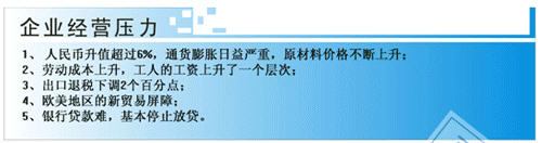 但是我們同時也應該看到,國內外經濟形勢也出現了新變化。外部經濟的不確定性因素加大,人民幣升值超過6%、出口退稅率下調2 個百分點、貸款利率上調幅度達到14.48%、勞動力成本壓力持續上升,國家從緊的宏觀政策也給行業發展帶來了壓力。2008年以來,數以千計的服裝廠倒閉,服裝行業必須利用新技術對其進行改造,才可以適應社會的發展。