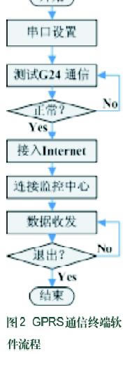 G24收發模塊采用AT指令操作,通過RS232串行口進行數據通信。GPRS 網絡通信原理為:首先通過SGSN節點使通信終端模塊附在GPRS網絡上;然后通過GGSN節點由PPP(Point to Point Protocol)協議獲得一個隨機分配的IP地址,連接到Internet上;最后通信終端模塊通過Internet,按照監控中心設定的端口號與監控中心建立通信鏈路。軟件流程如圖2所示。