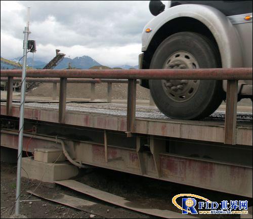 稱重臺出進口處的一根臨時桿上安裝了一臺 Identec 閱讀器,讀取每輛稱重卡車的 RFID 標簽