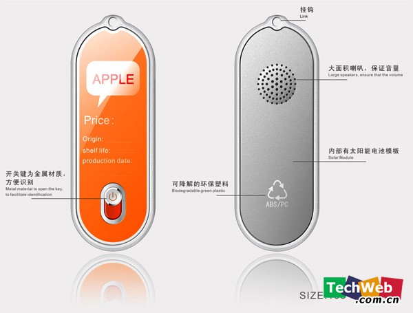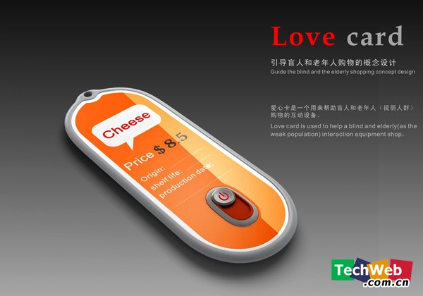 當我們漸漸老去,各個器官都會老化,這對于我們的年老的生活造成了很大的影響,而那些視力有障礙的人也是如此,尤其在購買東西時的不方便狀況比比皆是。為此設計師Shen Ming專為這些人群設計了一款智能導購,超薄的橢圓形外觀設計,正面配以醒目亮眼的橘黃色,背面采用灰色,可讓使用者分清正反,橡膠的外殼不易從手中滑落。它采用RFID技術并通過背面所帶的喇叭讀取出貨物的各項信息,減少了一些購物時的麻煩,太陽能充電電池讓這款導航儀更為節能環保。