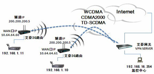 此組網方案是在艾泰3G路由器連接到公網監控中心的基礎上建立VPN隧道方式來傳輸視頻圖像,組網實施如下: