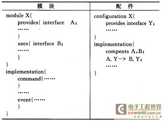 nesC是C語言的擴展,精通C語言的程序員掌握這種語言相對比較快。與C語言的存儲格式不同,用nesC語言編寫的文件是以“.nc”為后綴。每個nc文件實現一個組件功能(組件化/模塊化)。在nesC程序中,主要定義兩種功能不同的組件——模塊(module)和配件(configuration)。