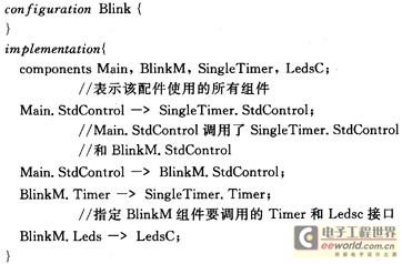 從上述代碼中可看出,該配件使用了Main組件,定義了Main接口和其他組件的調用關系,是整個程序的主文件,每個nesC應用程序都必須包含一個頂層配置文件。