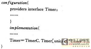 在模塊中,關鍵字“implementation”必須包含實現模塊提供和使用接口聲明的全部命令和事件。在配件中,關鍵字“implementation”定義執行部分,連接用“->”、“=”、“<-”等符號表示,“->”表示位于左邊的組件接口要調用位于右邊的組件接口。