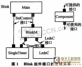 每一個nesC應用程序都是由一個或多個組件通過接口鏈接起來,并通過ncc/gcc編譯生成一個完整的可執行程序。下面以TinyOS軟件中的Blink應用程序為例,具體介紹nesC應用程序結構。