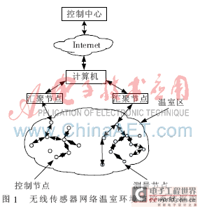 傳感器網絡節點由傳感器測量節點、控制節點和匯聚節點組成。測量節點負責采集周圍環境信息,采集的環境信息經多跳路由后到達匯聚節點,最終通過Internet到達控制中心。控制節點用來接收計算機傳來的遠程控制信息,對溫室環境參數進行調控。