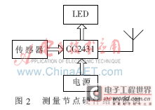 傳感器測量節點由傳感器模塊、微處理器模塊、無線通信模塊和電源模塊組成。其硬件結構框圖如圖2所示。