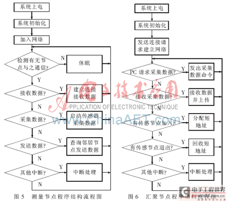 傳感器測量節點的主要功能就是接收PC機采集數據的指令、采集數據,然后將采集的數據通過無線信道發送出去。匯聚節點的功能就是創建無線網絡,配置網絡節點屬性,接收傳感器測量節點采集的數據,然后通過串口上傳到計算機。傳感器測量節點程序結構流程圖如圖5所示,匯聚節點程序結構流程圖如圖6所示。