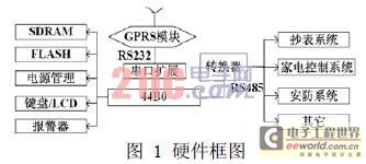 硬件部分的結構框圖如圖1所示,控制器是整個系統的核心部分,經過串口擴展與GPRS模塊相連;通過電平轉換芯片提供RS485總線接口與家用設備相連接;同時還提供LCD,鍵盤等交互接口。控制器的主控芯片采用三星S3C44B0,使用ARM7TDMI核,工作頻率在66MHz[1]。處理器外接 4MFlash(用于存儲控制器的啟動代碼和系統代碼以及當天事件的文本日志)分配到存儲器Bank0空間和4M×16的SDRAM,分配到存儲器的 Bank6空間。