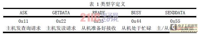用RS-485總線進行系統通訊需要對其傳輸協議做規定,最重要的就是幀結構的設計。本系統數據幀的構造包括:起始,地址,類型,數據長度,數據,校驗和及結束幀七個部分,除數據幀為N字節外(根據從機傳送的數據而定),其余均占1個字節。類型字定義如表1所示,類型幀中的“SENDDATA”幀為數據幀,用于存放從機設備的狀態信息,其它4種為指令幀,用于存放主機發送給從機的命令字[3]。