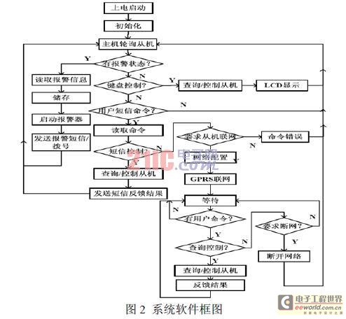 軟件流程如圖2所示,系統上電啟動后,首先對包括串口,LCD,鍵盤,GPRS模塊以及網絡配置文件等做相應的初始化。并檢測GPRS模塊和主機是否通訊正常。然后開始對從機進行輪詢,發現警情時,讀取并存儲報警信息,啟動報警器并將相應的報警信息通過撥號和短信的方式通知用戶。當收到用戶命令時,先判斷用戶的控制方式,再做出做出回應。