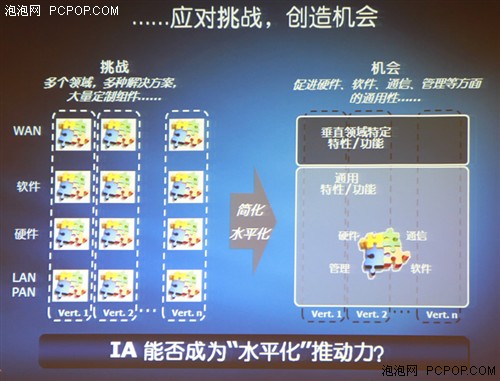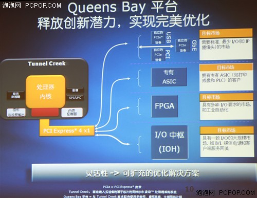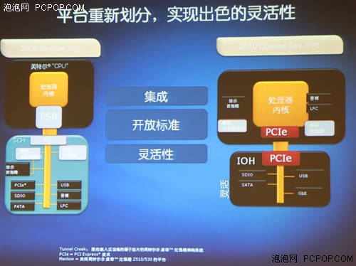 同時,為了移動物聯網Intel還改進了IA芯片,除了CPU部分以外,北橋和南橋都做出了相應的調整。北橋加入更多功能和應用,南橋可以通過通用的PCIE標準連接組合,并且開放南橋給第三方合作伙伴生產,這樣客戶就可以隨意的搭配不同的南橋,來滿足特定的需求。