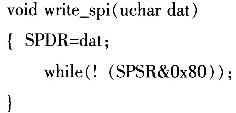 在本設計中,初始化要求SPIE=0,SPE=l,DORD=O,MSTR=1,CPOL=CPHA=l,SPRl=0,SPR0=1,通過“SPCR=0x5d”語句就可以對SPI接口初始化。