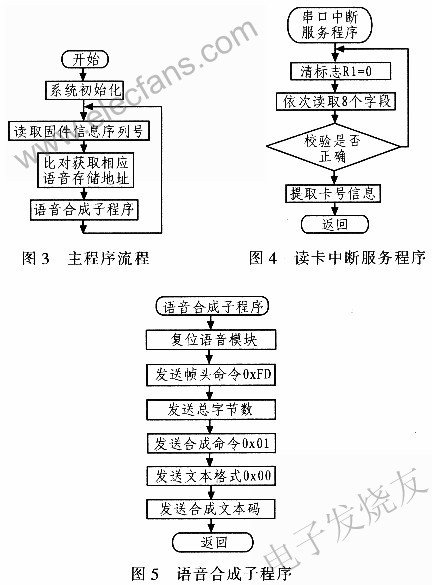 軟件系統由主程序、讀卡子程序、語音處理程序組成。其中,主程序完成系統的初始化(包括UART初始化和SPI初始化),如果有射頻卡接近天線,則讀卡模塊通過串口中斷發送TAG信息給單片機。單片機將此標簽信息與存儲的卡號信息比對,從而調用相應的語音文本信息送到XF -S4240模塊,播放相應的語音。