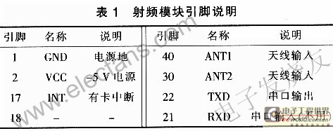 本系統采用北京完美公司的WM-01TA模塊來實現。該模塊配套有環行天線,工作頻率為125 kHz;具有異步串行通訊UART接口;默認串口波特率為9 600 b/s,無校驗,8位數據位,1位停止位;可讀取EM只讀感應體,讀卡距離為60~90 mm,讀卡速度大于0.5s,并且采用標準IC引腳DIP40外型,特別方便嵌入到目標線路板中。該射頻模塊共有7個引腳,引腳說明如表l所示。該器件價格低廉,完全滿足該項目設計需求。