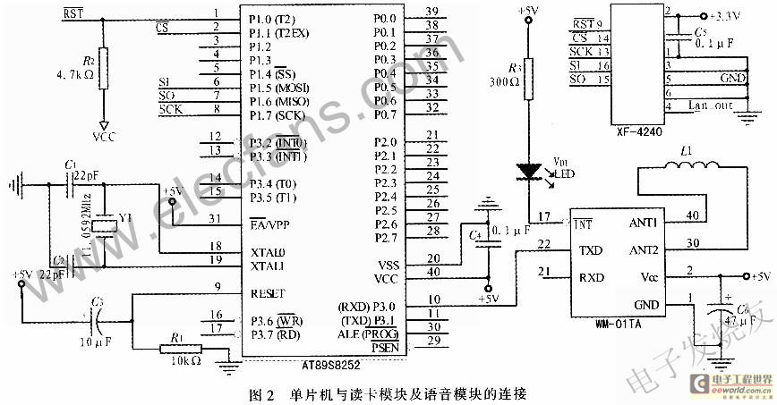 本系統設計中,射頻讀卡模塊具有UART接口,語音合成模塊具有UART和SPI接口。由于普通51單片機只有一個串口,因此存在串口的擴展問題。AT89C8252單片機是ATMEL公司的8位微處理器,具有SPI接口是AT89S8252不同于其他單片機的主要特點,它與51單片機完全兼容,但