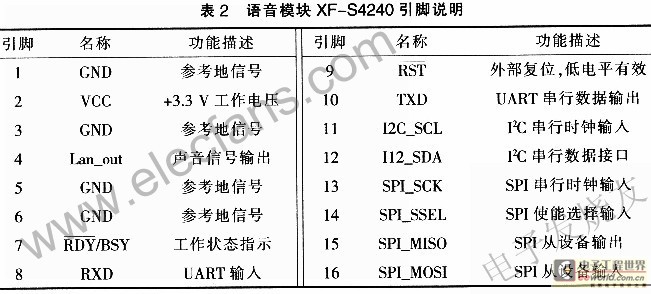 XF-S4240中文語音合成模塊是中科大訊飛信息科技有限公司面向高端應用推出的嵌入式中文語音合成模塊。可支持任意的中文文本、英文字母的[FS:PAGE]語音合成。該模塊通過異步串口(UART)、SPI接口及I2C總線3種方式接收待合成的文本,直接合成為語音輸出。該模塊支持GB2312、GBK、BIG5、UNICODE等4種內碼格式的文本,具有智能的文本分析處理算法,并支持多種控制命令,包括:合成、停止、暫停合成、繼續合成等。XF-S4240語音模塊封裝成16端子,各端子功能如表2所示。