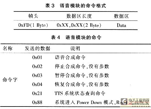 語音模塊的命令格式由幀頭、數據長度區及數據區3部分組成,各部分的定義如表3所示。語音模塊的命令如表4所示。