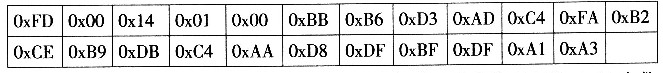 其中0xFD為幀頭,0x00為數據區長度的高字節,Ox14為數據區長度的低字節(注意:長度字節為合成代碼字節長+2),0x01為語音合成命令,0x00為GB2312的命令碼。0xBB、0xB6 為“歡”的GB2312碼,0xD3、0xAD為“迎”的GB2312碼……0xAD、0xA3為“。”的GB2312碼。
