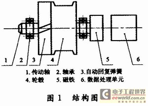基于磁敏角度技術的拉線式位移傳感器的功能是將拉線的機械位移換成可以計量、記錄或傳送的電信號,主要由自動回復彈簧、輪轂、磁鐵以及數據處理單元等部分構成,結構如圖1所示。