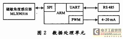 數據處理單元由磁敏角度感應器、微處理器單元、通信接口以及輸出模塊,具體的功能框如圖2所示。