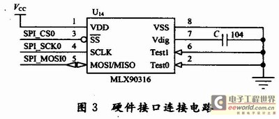 由于串行通信的輸出信號直接來自于MLX90316的內部DSP輸出,SPI輸出模式更穩定,誤差更小,并且具有更高的抗干擾能力。在本設計中,選用SPI接口,具體的硬件接口連[FS:PAGE]接電路如圖3所示。在圖3中,MLX90316的SPI三根線與ARM LPC2136的SPl0口連接。SPI(SerialProtocol InterIace)總線接口是一種同步串行外設接口。這是一個4根信號線的串行接口協議,包括主、從兩種模式。這4根信號線分別是:時鐘線(SCK)、數據輸入線(MISO)、數據輸出線(MOSI)和從設備使能線(SS)。