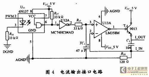數據處理單元具備一路可控4~20 mA的電流輸出,用于現場指示儀表的驅動。具體的連接電路如圖4所示。其中PWM2連接ARM的PWM2引腳,PWM信號用于控制光耦的導通與截止,反相器主要用于波形的整定,根據磁敏角度和位移關系,建立數學模型,計算出PWM的占空比,從而達到電流大小調節的目的。