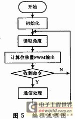 軟件編程主要包含3個模塊:PWM控制電流輸出模塊、RS 485通信模塊、MLX90316的SPI通信模塊,編程流程如圖5所示。PWM控制電流輸出模塊主要通過改變PWM的占空比來調節電流的大小。RS 485通信模塊主要用來接收上層系統的指令并根據指令將數據回傳。MLX90316的SPI通信模塊主要用于磁敏角度的讀取,SPI的通訊過程為:主控端先輸出1個0xAA以及1個0xFF作為通信起始信號,然后接著輸出8個0xFF,而從端會同時輸出2個0xFF、4個字節的角度信號以及4個0xFF,從而完成一次數據通訊。