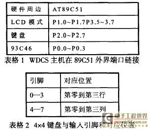 AT89C51是美國ATMEL公司生產的低電壓,高性能CMOS8位單片機,片內4kB可重擦寫的只讀程序存儲器(FPEROM)和128B的隨機存取數據存儲器(I認,兼容標準MCS51產品指令系統,32個可編程I/0口,2個l6位定時、計數器,6個中斷源,可編程串行UART通道。表格一為WDCS主機在89C51各個外界端口連接。在4x4鍵盤原理是利用列固定輸出與行讀入的電壓值,來當作該鍵鍵值。如當某一個按鍵被觸發時,所對應的行跟列會導通,列固定端輸出低電位,然后再去讀回行的電壓值,哪一行的電壓值低,表示該鍵被按下,解碼的公式為按鍵值=列×4+行。表格2為4x4鍵盤的輸入引腳和對應位置。在EEPPROM93C46作為存儲密碼,并且在電源消失后仍要能記錄。
