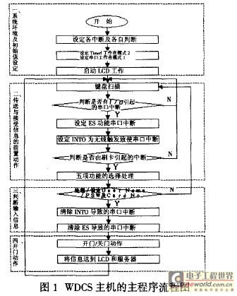 圖1WDCS主機的主程序流程圖WDCS的基本架構分成四步。第一步是基本的系統運作,包含系統環境及初始值設定等。第二步是計時器發生中斷。負責傳送或接收信息。第三步是判斷輸入輸出的信息是否正確。第四步是負責開門動作。