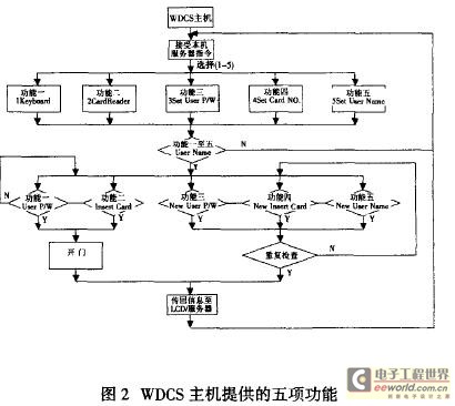 輸入方面該系統提供4x4鍵盤作為輸入設備,包含9個數字鍵、2個方向鍵、3個功能鍵,使用者可使用這些鍵選擇功能表單。以及輸人與修改用戶名和密碼,并控制繼電器做開門關門的動作,進而達到門禁的目的。如圖二所示,WDCS主機提[FS:PAGE]供了五項功能的選擇:Keyboard主要功能是讓用戶經由終端鍵盤或者本機鍵盤輸入密碼。首先以方向鍵選擇到Keyboard后按下Enter鍵,在輸入UserName和Password,如輸入正確則開門,并送回信息到LCD顯示屏與WDCS服務器,如輸入錯誤系統會分別要求重新輸入。CardReader功能是讓用戶經由讀卡頭刷卡輸入密碼。首先以方向鍵選擇到CardReader后安下Enter鍵。在輸入UserName和Card.如輸入正確則門禁會打開。并回送訊息到LCD顯示屏與WDCS服務器。如輸入錯誤系統分別會要求重新輸入和重新刷卡。SetUserP/W(Password)功能是修改使用的密碼。首先以方向鍵選擇到SetUserP/W后按下Enter鍵,在輸入UserName.如果正確則繼續輸入NewUserP/W和再輸入確認NewUserP/W一次。如輸入無誤則成功更改新的密碼并回送信息到LCD顯示屏與WDCS服務器。如輸入錯誤系統分別會要求重新輸入UserName和SetNewUserP。SetCardNo.功能是讓用戶設定新卡號碼,首先以方向鍵選擇到SetCardNo.后按下Enter鍵。再輸入UserName.如果正確則繼續輸入NewCardNo.和在刷入確認NewCardNo.一次,如刷入或刷入錯誤。系統分別會要求重新輸入UserName和重新SetCardN0_o最后SetUserName功能是設定用戶的名稱,首先以方向鍵選擇到SetUserName后按下Enter鍵。再輸入UserName.如果正確則繼續設定NewUserName和再輸入確認NewUserName一次。如輸入無誤則成功設定NewUserName并回送信息到LCD顯示屏與WDCS服務器如輸入錯誤系統分別會要求重新輸入UserName和SetNewUserName。