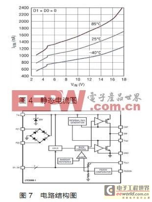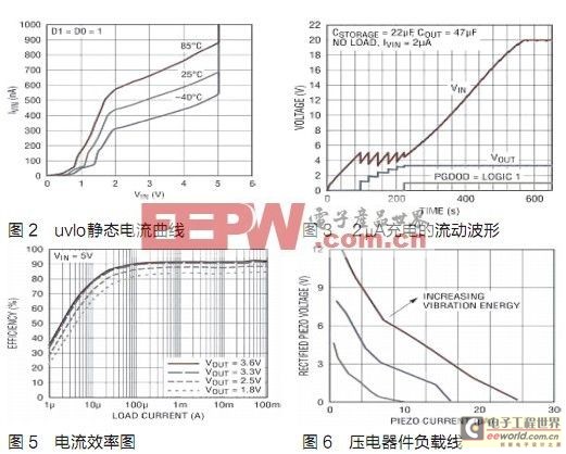 圖2顯示了 UVLO 靜態電流曲線,該曲線是隨 VIN 單調變化的,因此一個低至 700nA 的電流源就可以將輸入電容器充電至 UVLO 的上升門限,從而產生一個穩定的輸出。一旦達到穩定,LTC3588-1 就進入休眠狀態,在這狀態下,輸入和輸出靜態電流都是最小的。例如,在 VIN = 4.5V,輸出穩定時,靜態電流僅為 950nA。然后降壓型轉換器按照需要接通和斷開,以保持穩定。在休眠模式和 UVLO 模式,低靜態電流都允許在輸入電容器庫中積累盡可能多的能量,即使可用電源電流非常低也不例外。