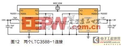 很多系統需要多個電源軌為不同的組件供電。微處理器可能使用 1.8V,可是無線發送器可能需要 3.6V。兩個 LTC3588-1 器件可以連接到一個壓電器件上,并同時為每個輸出供電,如圖12所示。這種配置具有自動電源排序功能,具有較低電壓輸出 (即較低 UVLO 上升門限) 的 LTC3588-1 先開始工作。隨著壓電器件提供輸入功率,兩個 VIN 軌最初同時開始工作,但是當一個輸出開始消耗功率時,僅與[FS:PAGE]其對應的 VIN 下降,因為每個 LTC3588-1 的橋提供隔離。然后,輸入壓電能轉至這個較低電壓的電容器,直到兩個 VIN 軌再次相等為止。這種配置可擴展至多個由單個壓電器件供電的 LTC3588 器件,只要壓電器件能夠支持所有 LTC3588-1 合起來的總靜態電流就行。