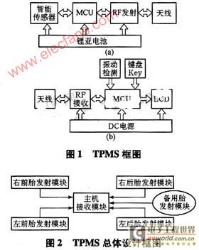 由傳感器、MCU、發射、接收等主要芯片組成的TPMS結構框圖如圖1所示