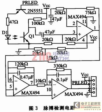 脈搏檢測電路包括光電傳感器及其信號調理電路,如圖3所示。光電傳感器由紅光發射管D1和光敏三極管Q1構成,兩者相對安裝于遮光指套內。測量脈搏時,發射光中的一部分透過指尖,照射到光敏三極管的受光面,透射光強隨脈搏起伏呈現極微小變化,經光敏三極管光一電轉換后,輸出直流和微弱交流相疊加的混合電壓信號。該信號經隔直、低通濾波和放大處理后,成為峰值接近Vcc/2的模擬脈搏信號,再由JN5139進行A/D轉換、數字濾波和周期判定,最終得到以min為單位的脈率值。為解決個體差異等原因導致脈搏輸出信號飽和或過小的問題,發射管的工作電流由JN5139通過D/A轉換器自動調節。