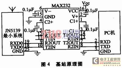 基站采用上、下位機結構,如圖4所示。作為網絡協調器的下位機為JN5139最小系統,上位機采用PC機,兩者通過異步串口進行通信(波特率為115.2 kbps)。圖中JN5139最小系統和MAX232電平轉換器均采用3.6 V盲流電源供電。