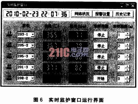 在室內環境下對1個基站、5個無線路由器、10個傳感器終端組成的系統進行多次組網實驗和性能測試。圖6為基站上位監控軟件實時監護窗口的運行界面,該窗口可同時顯示5個傳感器終端采集的最新數據。