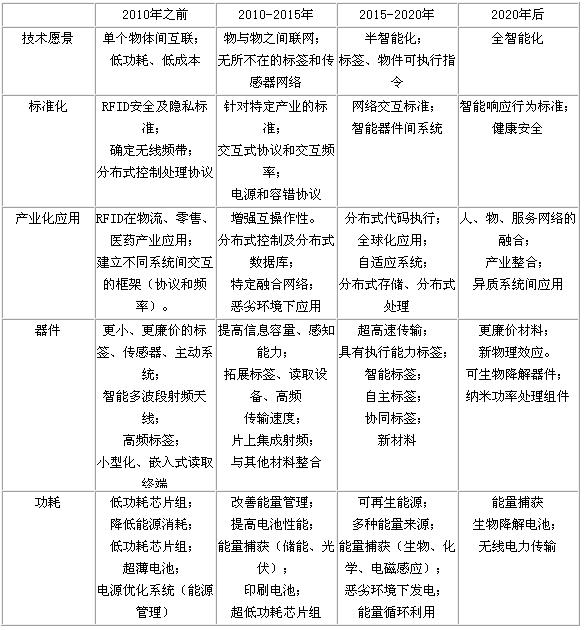 歐洲智能系統集成技術平臺(EPoSS)在《Internet of Things in 2020》報告中分析預測,未來物聯網的發展將經歷四個階段,2010年之前RFID被廣泛應用于物流、零售和制藥領域,2010-2015年物體互聯,2015-2020年物體進入半智能化,2020年之后物體進入全智能化。就目前而言,許多物聯網相關技術仍在開發測試階段,離不同系統之間融合、物與物之間的普遍鏈接的遠期目標還存在一定差距。EPoSS提出的各階段物聯網[FS:PAGE]技術研發、產業化、標準化等工作的重點如下。