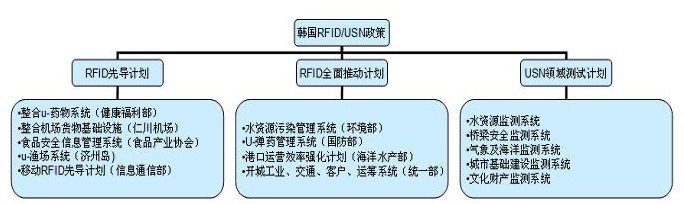自1997年起,韓國政府出臺了一系列推動國家信息化建設的產業政策,如下表。達成上述政策目標,實現建設u化社會的愿景,韓國政府持續推動各項相關基礎建設、核心產業技術發展,RFID/USN(傳感器網)就是其中之一。韓國政府最早在“u-IT 839”計劃就將RFID/USN列入發展重點,并在此后推出一系列相關實施計劃。目前,韓國的RFID發展已經從先導應用開始全面推廣,而USN也進入實驗性應用階段。