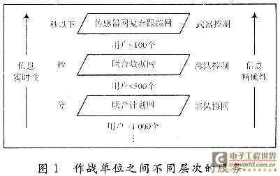 信息基礎設施是網絡中心戰的重要環節,這些設施為作戰行動的所有單元提供高質量的信息服務。這些單元包括部署的部隊、支援部隊以及聯盟伙伴等。如圖1所示,對高質量信息的需求隨著每一個單元任務的要求不同而不同。行動領域的高端是聯合感知和火力打擊,實現這一目標需要高速的數據傳輸速率和快速反應的信息傳輸能力,使用具有協同作戰能力的復合跟蹤網絡(傳感器網)。中間層次是不同類型的指揮控制行動,這些行動可以允許信息延遲數秒,主要由戰術數據鏈(主要運用LINKl6/10)支持。其他類型的指揮控制以及后勤保障行動,對[FS:PAGE]時間的要求并不十分緊迫,應用全球指揮控制系統(global command and control system,GCCS)等聯合規劃網絡。