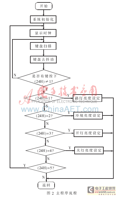 控制器上電一復位,立即顯示當前時鐘,若時鐘不正確,可通過第二及第三個按鍵分別調整小時和分鐘。第一次按動復合鍵,進入路燈亮度設定,通過第二個按鍵的調整,可以改變路燈的亮度;第二次按動復合鍵,進入環境亮度設定,可通過第二個按鍵調整;第三次按動復合鍵,進入路燈開燈時間的設定,通過第二及第三個按鍵分別設定開燈小時和分鐘;第四次按動復合鍵,進入路燈關燈時間的設定,通過第二及第三個按鍵分別設定關燈小時和分鐘;第五次按動復合鍵,退出當前設置,返回正常走時狀態。