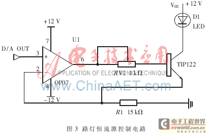 采用功率為1 W的燈泡模擬路燈,通過繼電器來控制燈泡的開關狀態。采用TIP122和OP07型達林頓管相結合的方案控制燈泡的電流,實現恒流源控制。具體電路如圖3所示。